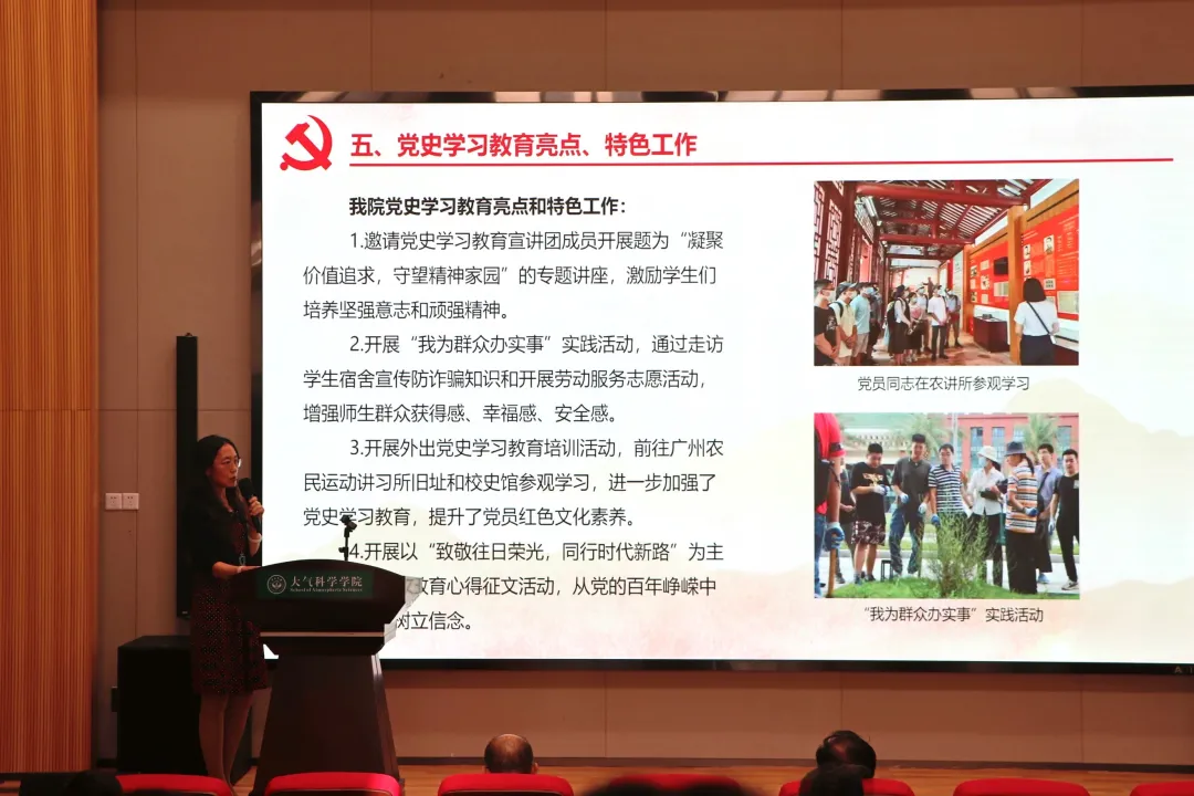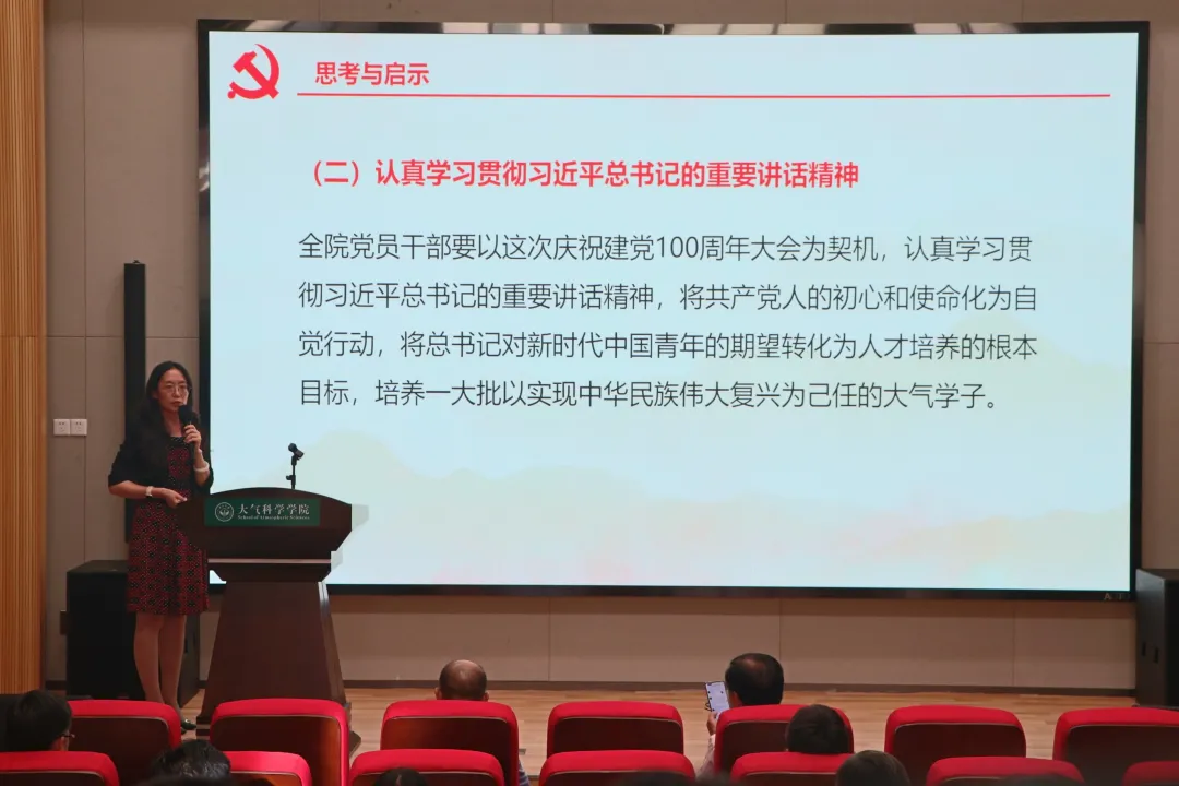 随后,郑慧书记传达习近平总书记在庆祝中国共产党成立100周年大会上的重要讲话精神。郑书记表示,习近平总书记重要讲话总揽全局、内容深邃、思想深刻、催人奋进,回顾了党的百年光辉历程,并为新征程上党和国家各项事业发展明确了前进方向。郑书记号召全体党员,积极响应党中央的号召,践行初心使命,为党和人民争取更大光荣。她同时要求全院教师,牢记“为党育人、为国育才”的使命,立足教学、科研、管理本职工作,为办好一流的大气科学专业、推动我院各项事业高质量发展努力奋斗。