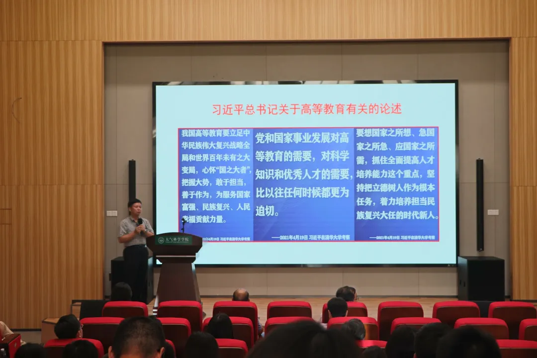 为学习宣传贯彻习近平总书记“七一”重要讲话精神,对2021年春季学期的各项工作进行部署和总结,进一步统一思想、振奋精神、凝聚共识,7月5日下午,学院2021年春季学期教职工大会在海琴二号B101学术会议厅举行。学院全体教职工参加大会,会议分两个部分进行,第一部分为专题学习和工作部署,第二部分为专题讲座。会议由董文杰院长主持。