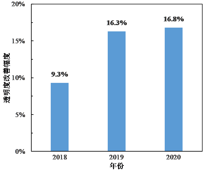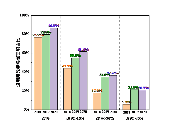 渤海综合治理期间(2018—2020年)透明度改善幅度(左)和透明度改善海域面积占比(右)
