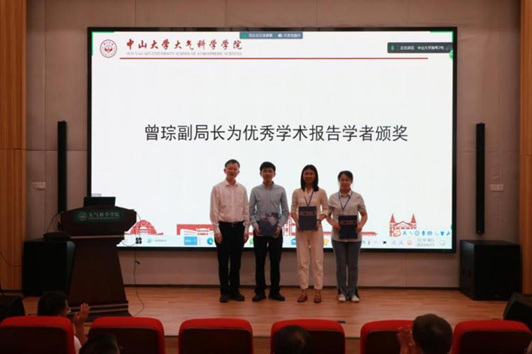 报告结束后,广东气象部门领导以及学院教师分别对本次论坛发表感想,并盛情邀请各路优秀学者人才加盟,共同建设粤港澳大湾区。同时与会专家也对青年学者进行报告评议与评奖,休斯顿大学研究助理教授周珊、清华大学博士后李钊、中山大学博士生陈冠文获得本次论坛优秀学术报告奖,由曾琮副局长为三人颁奖并致以祝贺。
