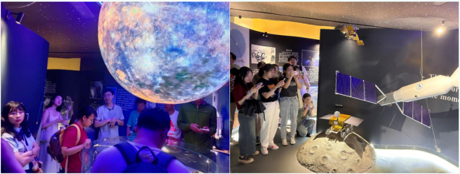 授课之余,学院还安排了参观环节。7月11日-12日晚,志愿者带领学员参观了学校校园和行星科学教学仿真实验室。实验室以人类太空探索的历史进程为主线,包括了球幕影厅、三维星球地貌投影、VR体验太空舱、自主研发的极光罐等先进科教设备,从木星上的“大红斑”到地球上发现的恐龙化石,从古代的夜观天象到现在的风云系列卫星,内容丰富多样,学员们收获满满。