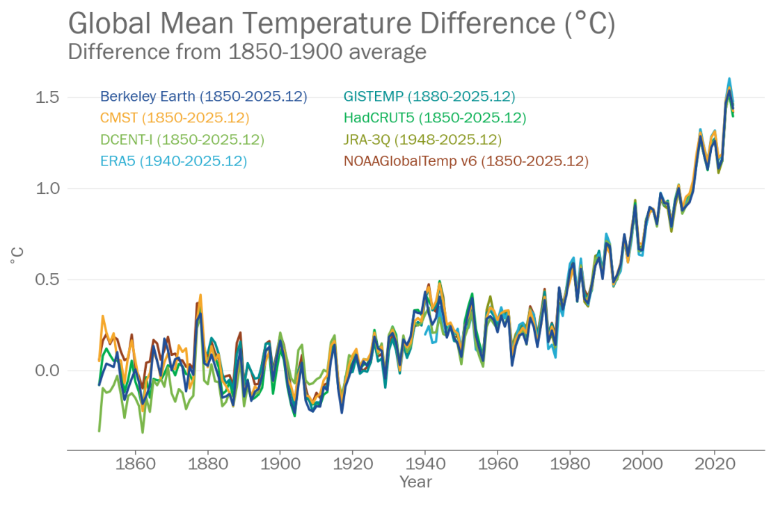 北京时间1月14日23:00,世界气象组织(WMO)发布2025年全球温度变化研究报告,报告融合了中国、美国、英国、日本及ECMWF等8个团队研发的核心数据集,形成权威信息源,确认2025年成为有记录以来最暖年份之一(图1)。基于此,世界气象组织秘书长塞莱斯特·索洛表示:“基于全球协作与科学严谨的数据采集,世界气象组织的气候监测工作比以往任何时候都更为重要。我们必须确保地球气候信息兼具权威性、可获取性与可操作性,真正惠及全人类。”
