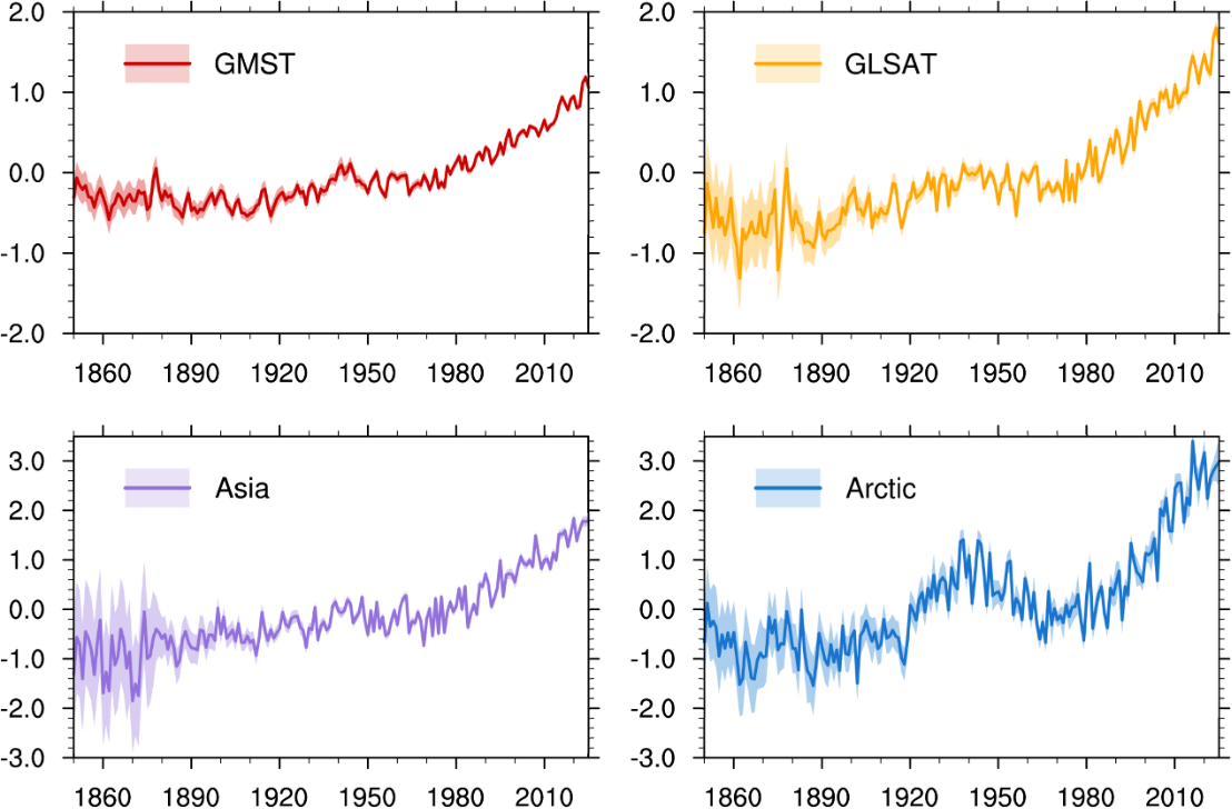 图2基于China-MST3.0数据集给出2025年全球及区域温度序列及其不确定性