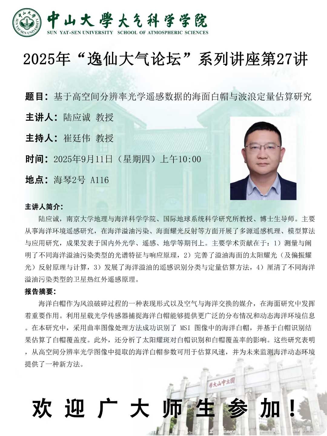 【学术预告】(2025年“逸仙大气论坛”系列讲座第27讲)基于高空间分辨率光学遥感数据的海面白帽与波浪定量估算研究