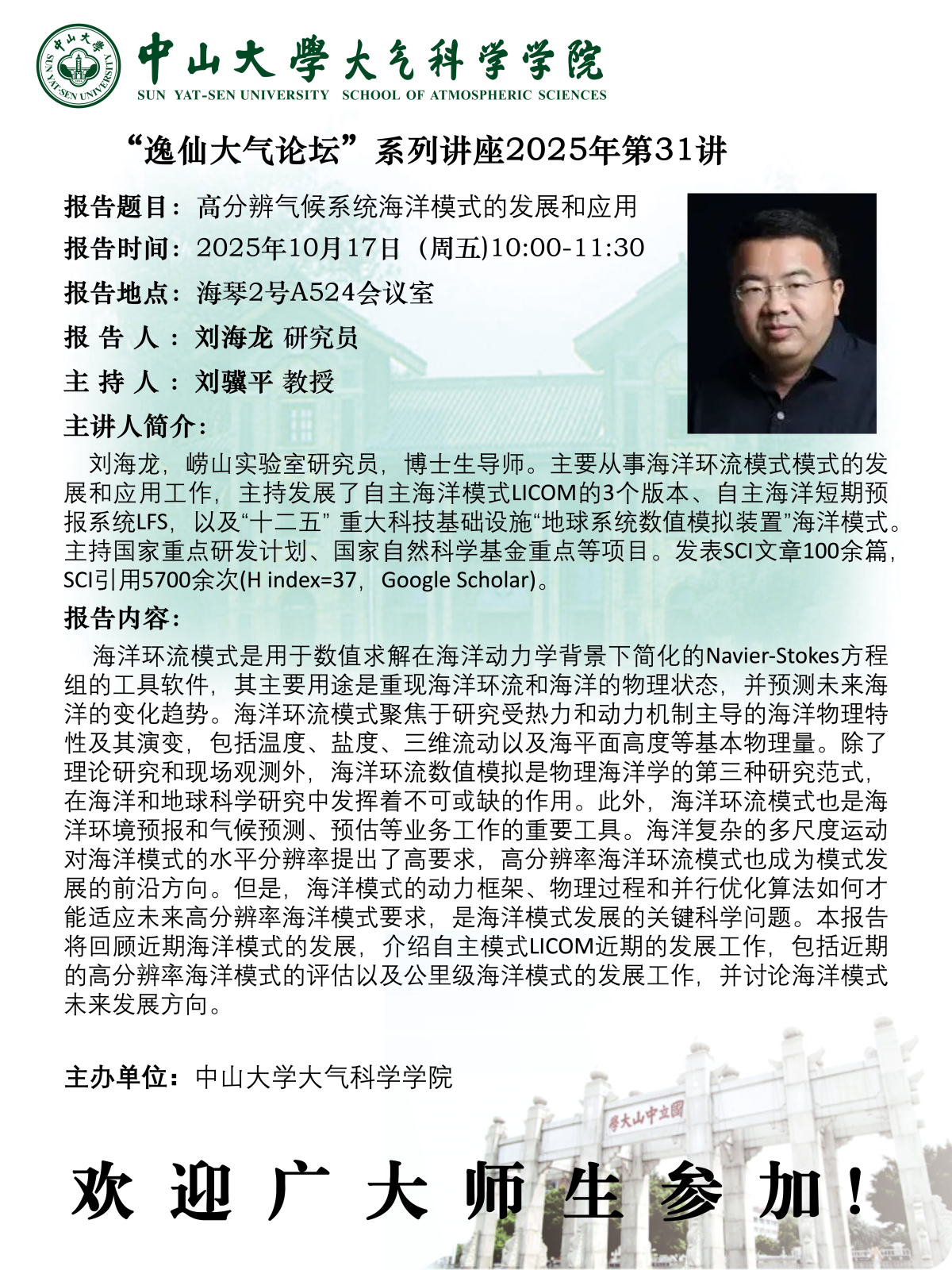 【学术预告】(2025年“逸仙大气论坛”系列讲座第31讲)高分辨气候系统海洋模式的发展和应用