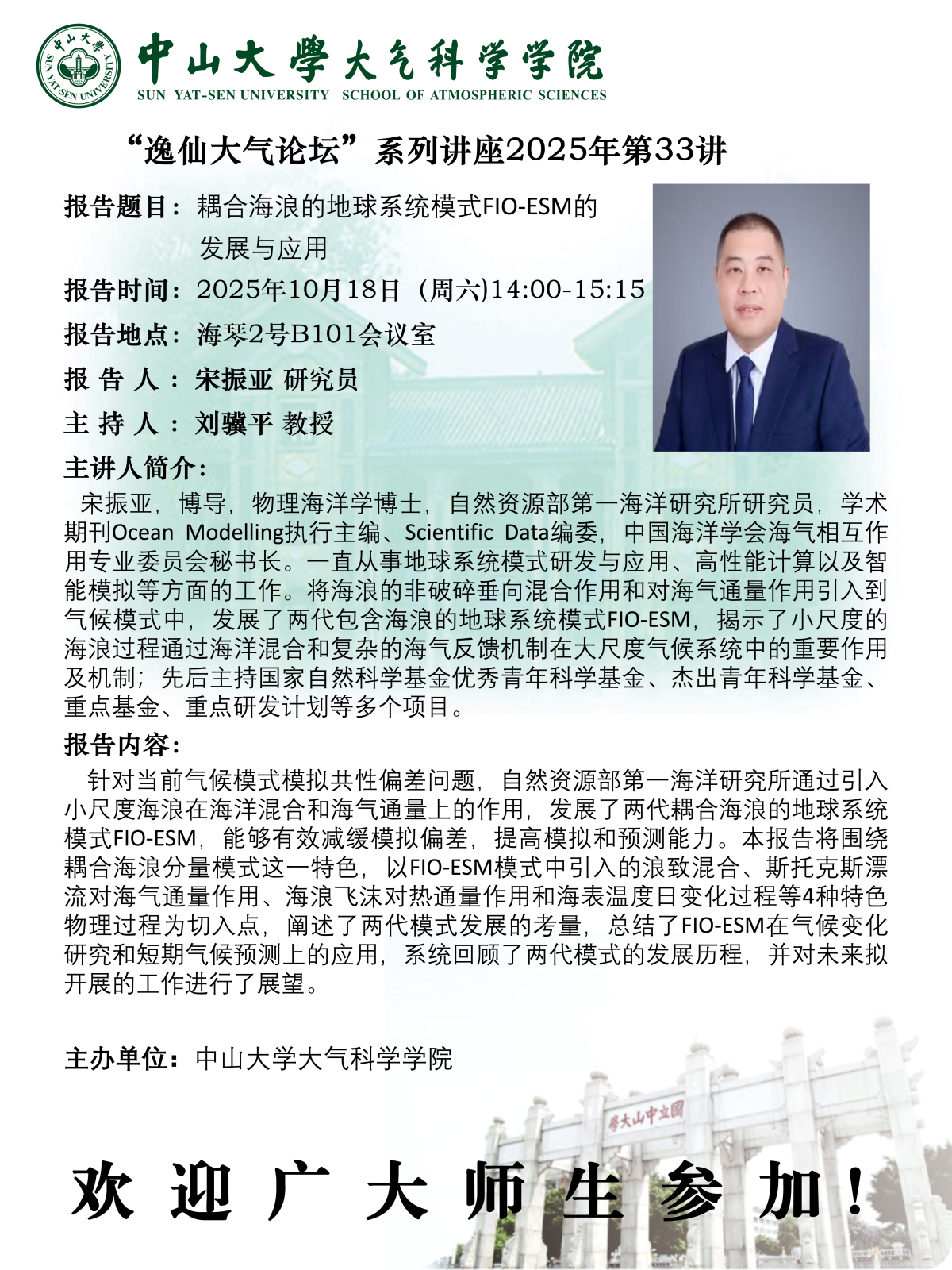 【学术预告】(2025年“逸仙大气论坛”系列讲座第33讲)耦合海浪的地球系统模式FIO-ESM的发展与应用