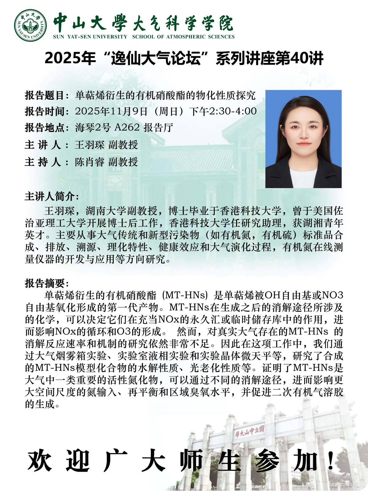 【学术预告】(2025年“逸仙大气论坛”系列讲座第40讲)单萜烯衍生的有机硝酸酯的物化性质探究