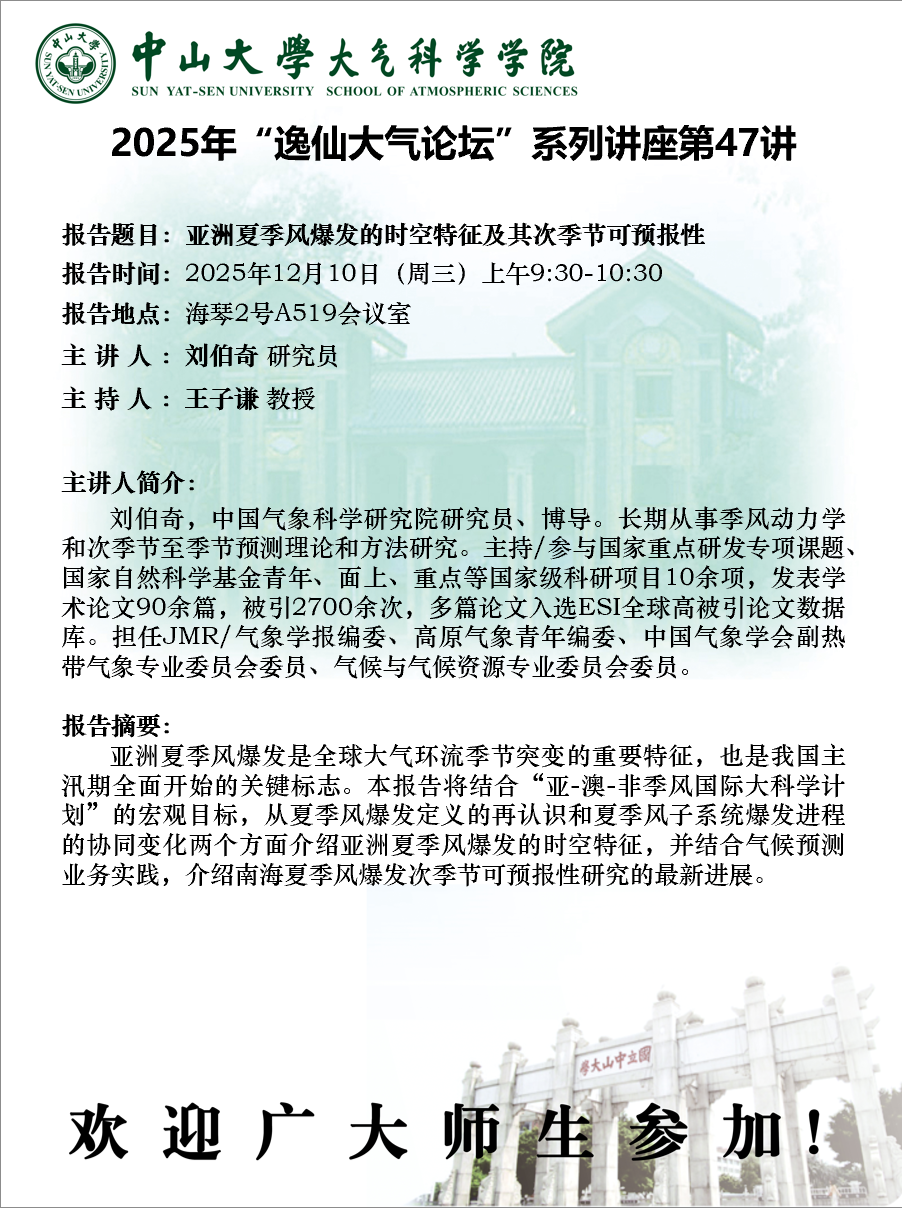 【学术预告】(2025年“逸仙大气论坛”系列讲座第47讲)亚洲夏季风爆发的时空特征及其次季节可预报性