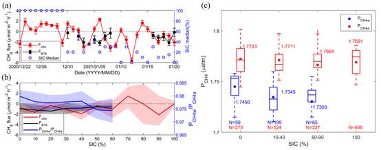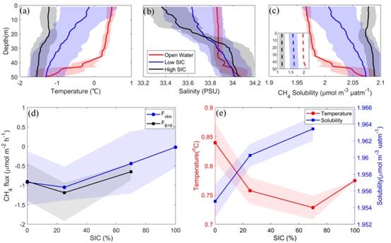 进一步分析表明,SIC在10-40%范围时,海洋对大气中CH4吸收最强,其原因是海冰融化生成的淡水具有低温、低盐度和高溶解度特征,促进了对大气CH4的吸收(图2)。