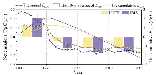 鉴于我国土地利用变化的特殊性,团队在已有LUCE模型和IBIS动态植被模型的基础上,融合森林普查数据更新了全国高分辨率LUC数据集,定量核算了我国1981-2020年间LUC碳排放的时空变化。研究结果令人振奋,我国LUC的净碳通量在20世纪80年代仍为碳排放源,但自90年代起转为碳吸收汇(如图)。尤其近20年来,每年吸收二氧化碳5亿多吨,相当于全国陆地净碳汇(包括未发生转化的原始生态系统)的三分之一。实证研究表明我国LUC的净碳汇效应远高于全球核算结果,长期生态治理的成效凸显。