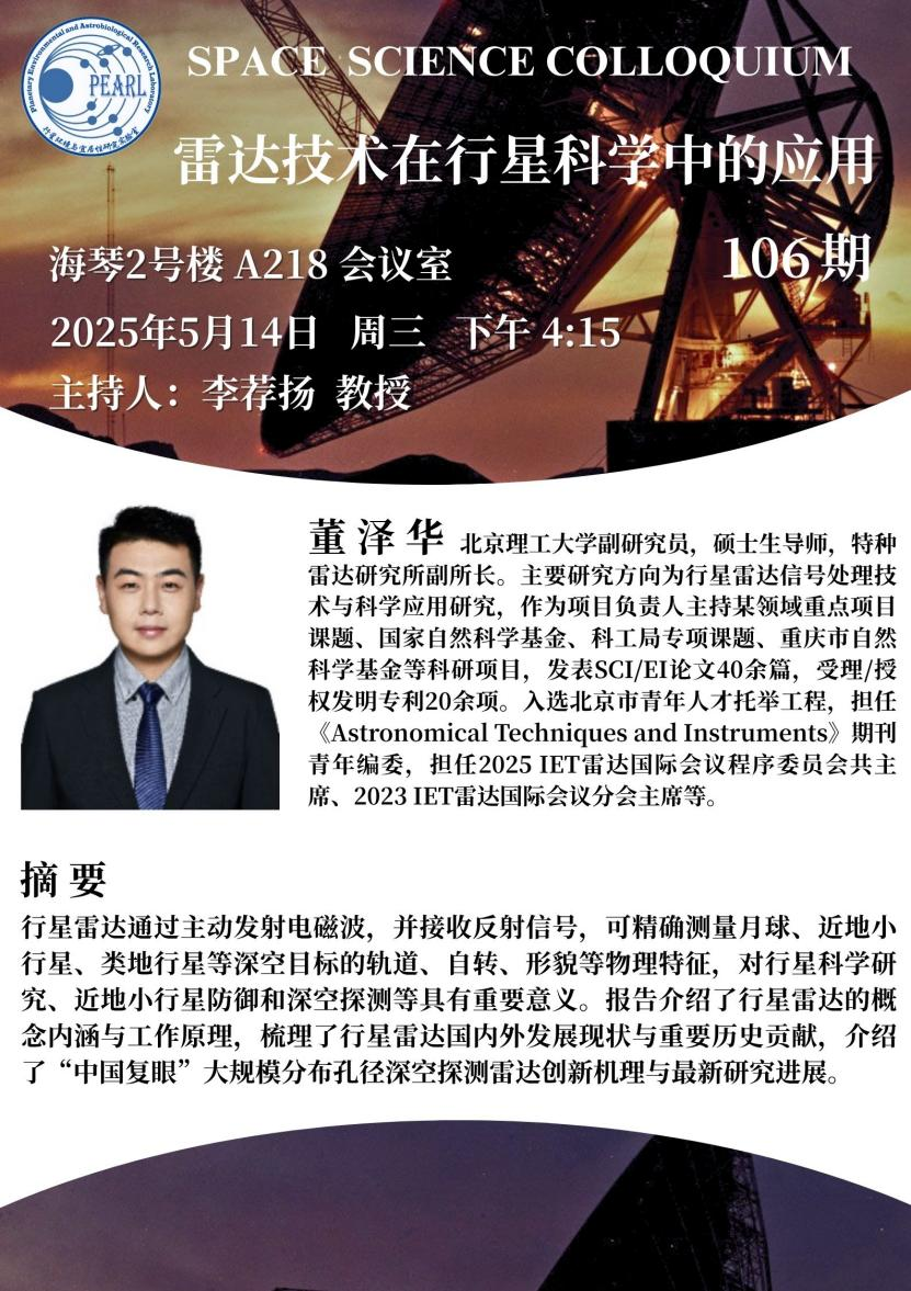 报告人简介:董泽华,北京理工大学副研究员,硕士生导师,特种雷达研究所副所长。主要研究方向为行星雷达信号处理技术与科学应用研究,作为项目负责人主持某领域重点项目课题、国家自然科学基金、科工局专项课题、重庆市自然科学基金等科研项目,发表SCI/EI论文40余篇,受理/授权发明专利20余项。入选北京市青年人才托举工程,担任《Astronomical Techniques and Instruments》期刊青年编委,担任2025 IET雷达国际会议程序委员会共主席、2023 IET雷达国际会议分会主席等。