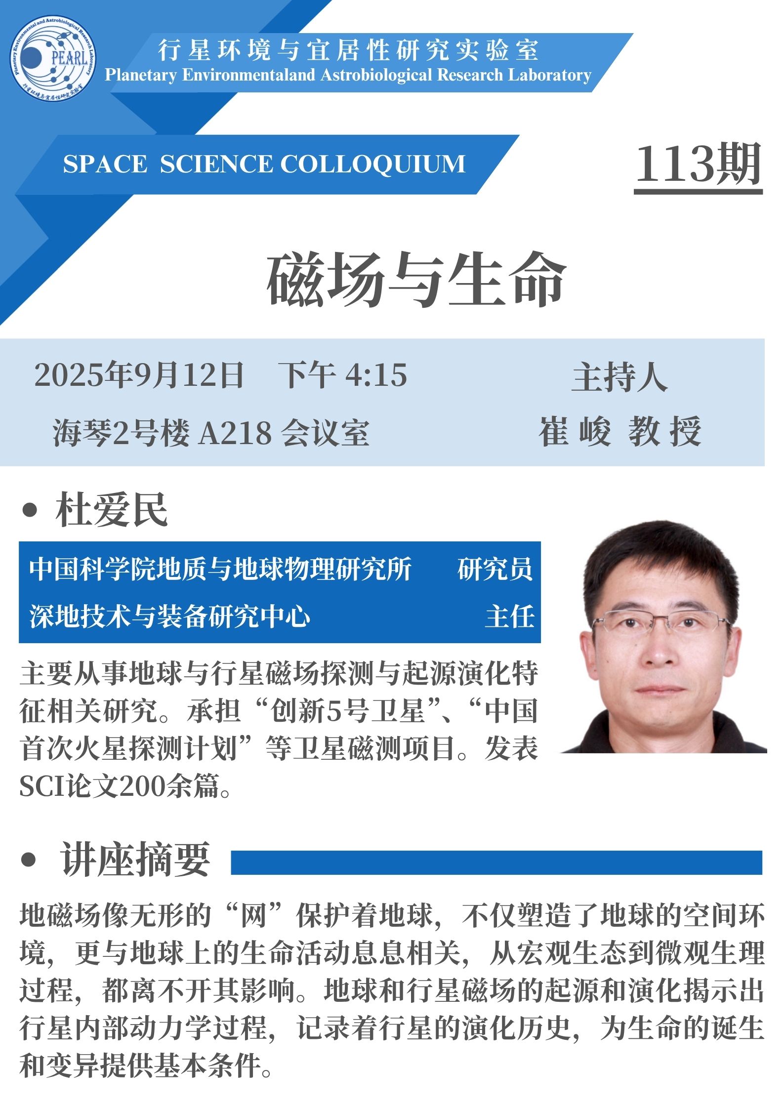 讲座摘要:地磁场像无形的“网”保护着地球,不仅塑造了地球的空间环境,更与地球上的生命活动息息相关,从宏观生态到微观生理过程,都离不开其影响。地球和行星磁场的起源和演化揭示出行星内部动力学过程,记录着行星的演化历史,为生命的诞生和变异提供基本条件。