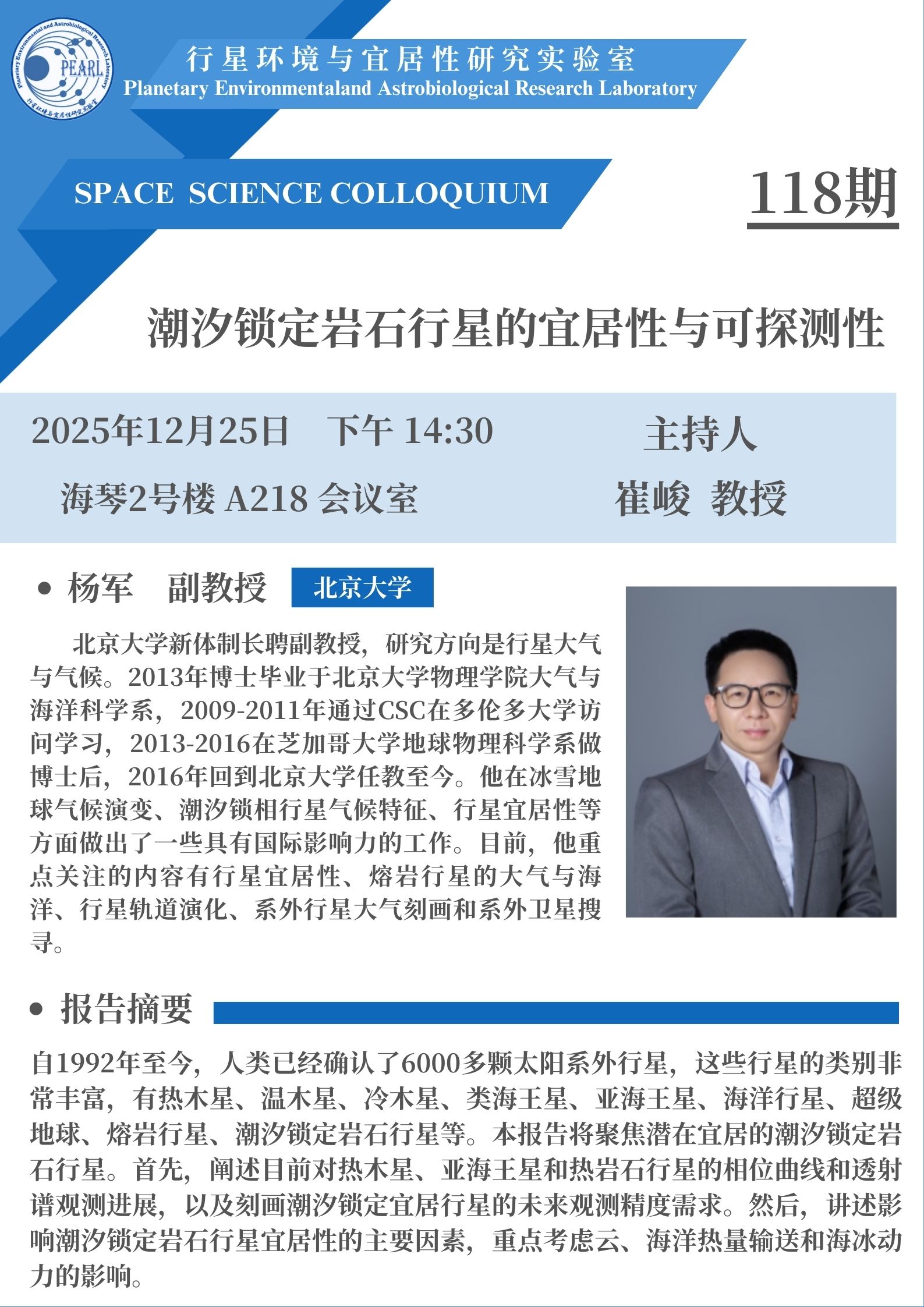 报告人 杨军 北京大学新体制长聘副教授,研究方向是行星大气与气候。2013年博士毕业于北京大学物理学院大气与海洋科学系,2009-2011年通过CSC在多伦多大学访问学习,2013-2016在芝加哥大学地球物理科学系做博士后,2016年回到北京大学任教至今。他在冰雪地球气候演变、潮汐锁相行星气候特征、行星宜居性等方面做出了一些具有国际影响力的工作。目前,他重点关注的内容有行星宜居性、熔岩行星的大气与海洋、行星轨道演化、系外行星大气刻画和系外卫星搜寻。