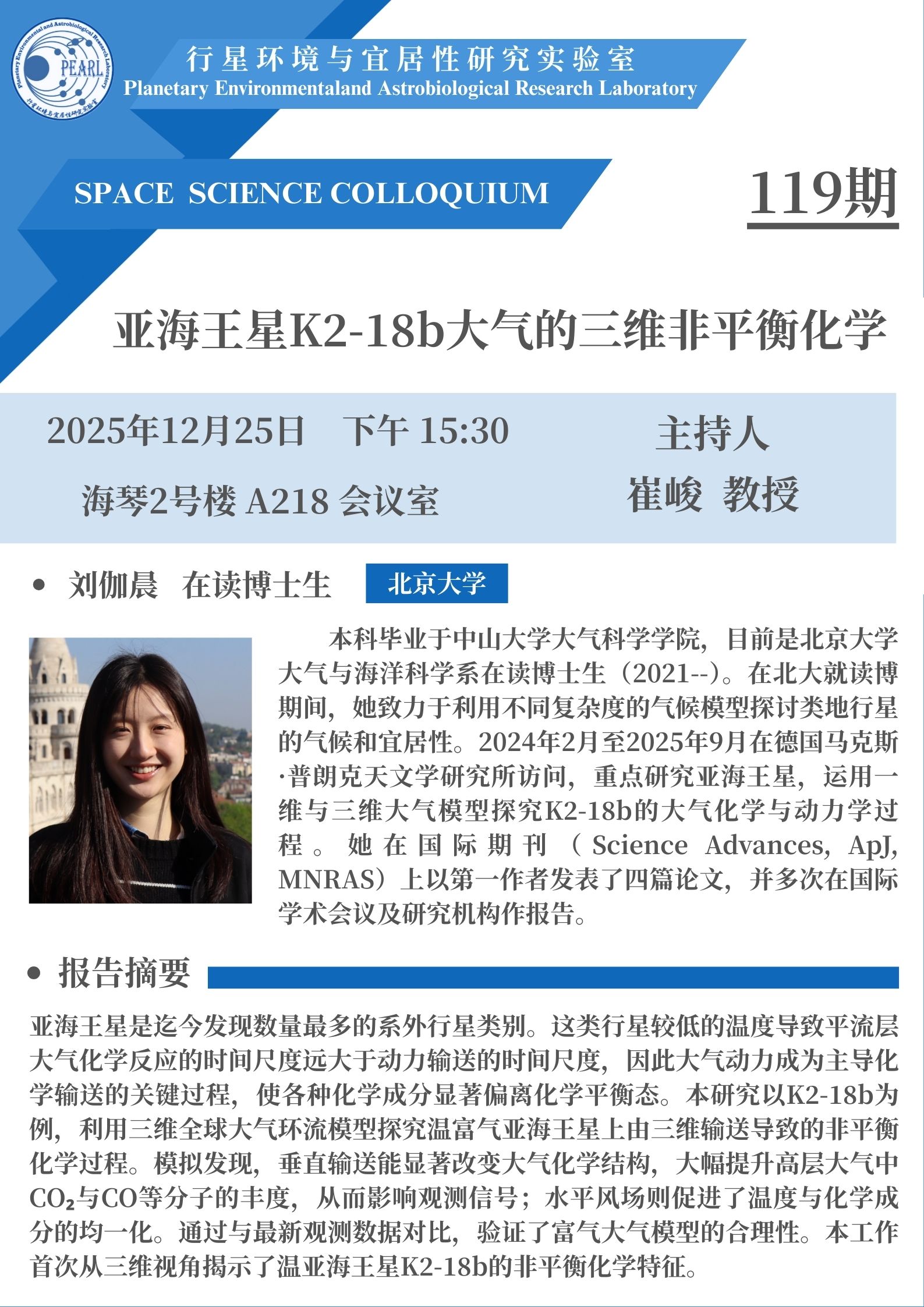刘伽晨 在读博士生 北京大学 本科毕业于中山大学大气科学学院,目前是北京大学大气与海洋科学系在读博士生(2021--)。在北大就读博期间,她致力于利用不同复杂度的气候模型探讨类地行星的气候和宜居性。2024年2月至2025年9月在德国马克斯普朗克天文学研究所访问,重点研究亚海王星,运用一维与三维大气模型探究K2-18b的大气化学与动力学过程。她在国际期刊(Science Advances,ApJ,MNRAS)上以第一作者发表了四篇论文,并多次在国际学术会议及研究机构作报告。
